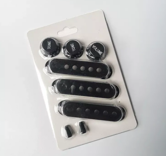 Black Strat Pickup Covers Knobs and 5 Way Switch Tip Cap