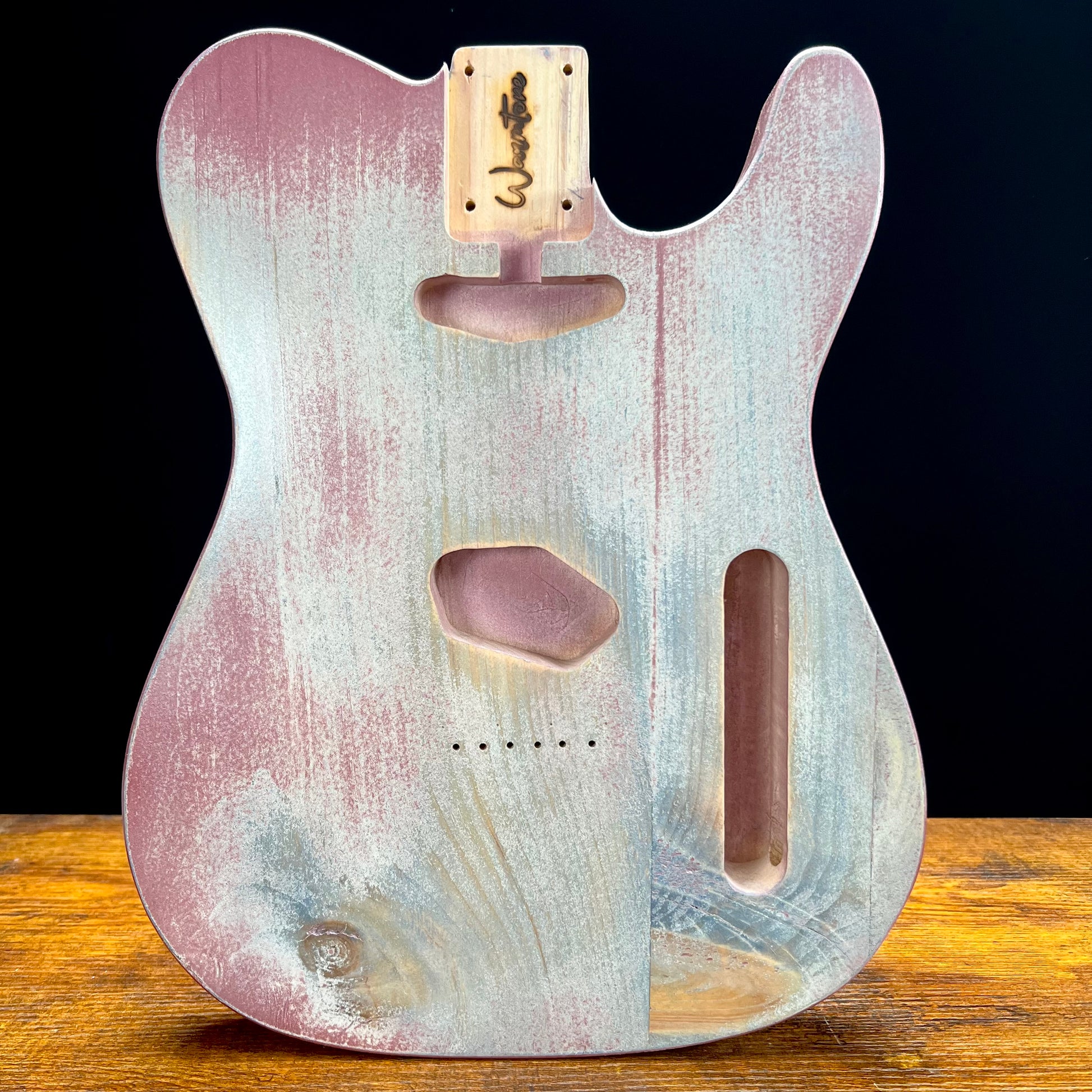 Showcasing a beautifully aged look, the Warmtone Custom Guitars Relic Tele Style Guitar Body in "Pink Winter" Nitro is truly unique. While the photos do not reveal any cracking, this guitar body may develop cracks in the future.