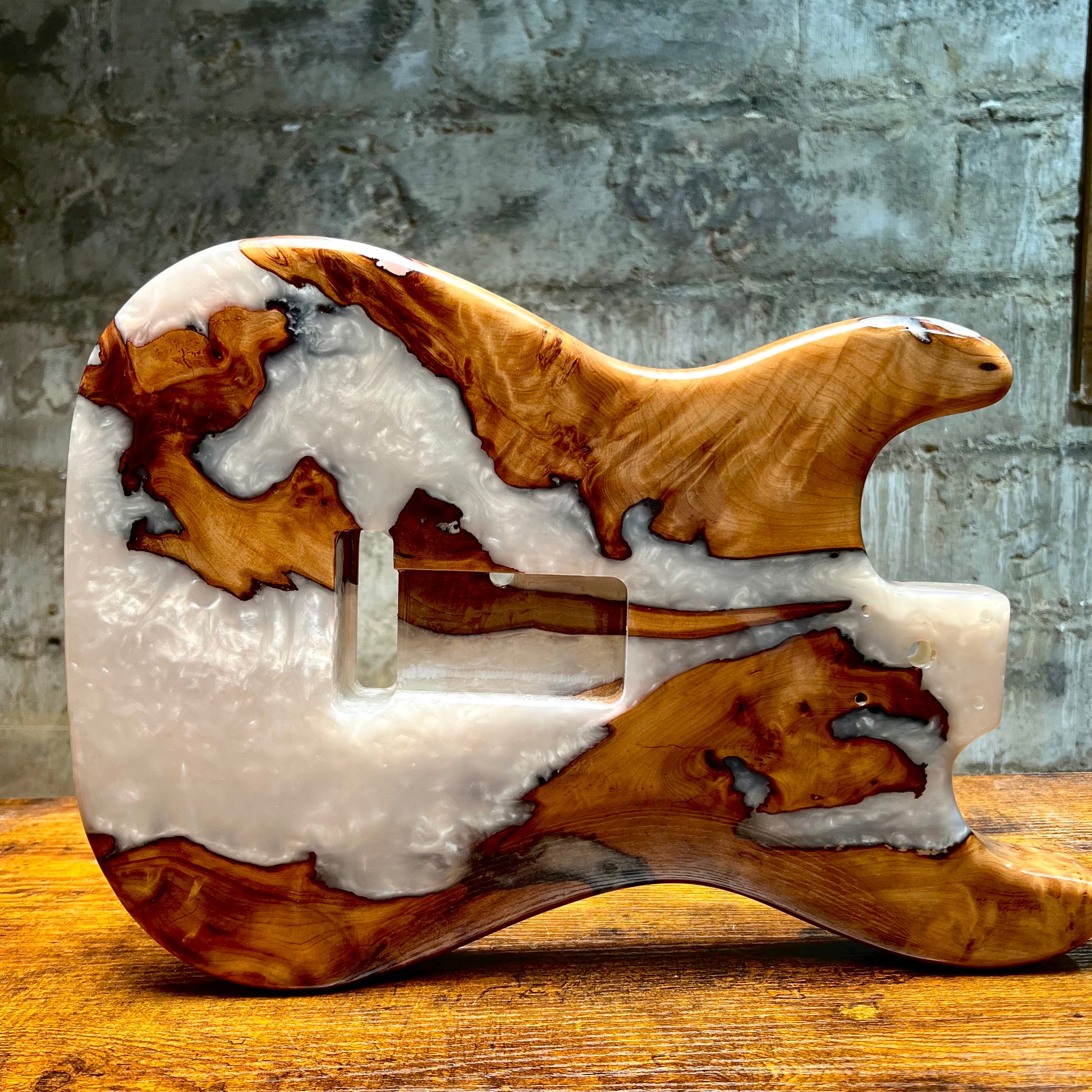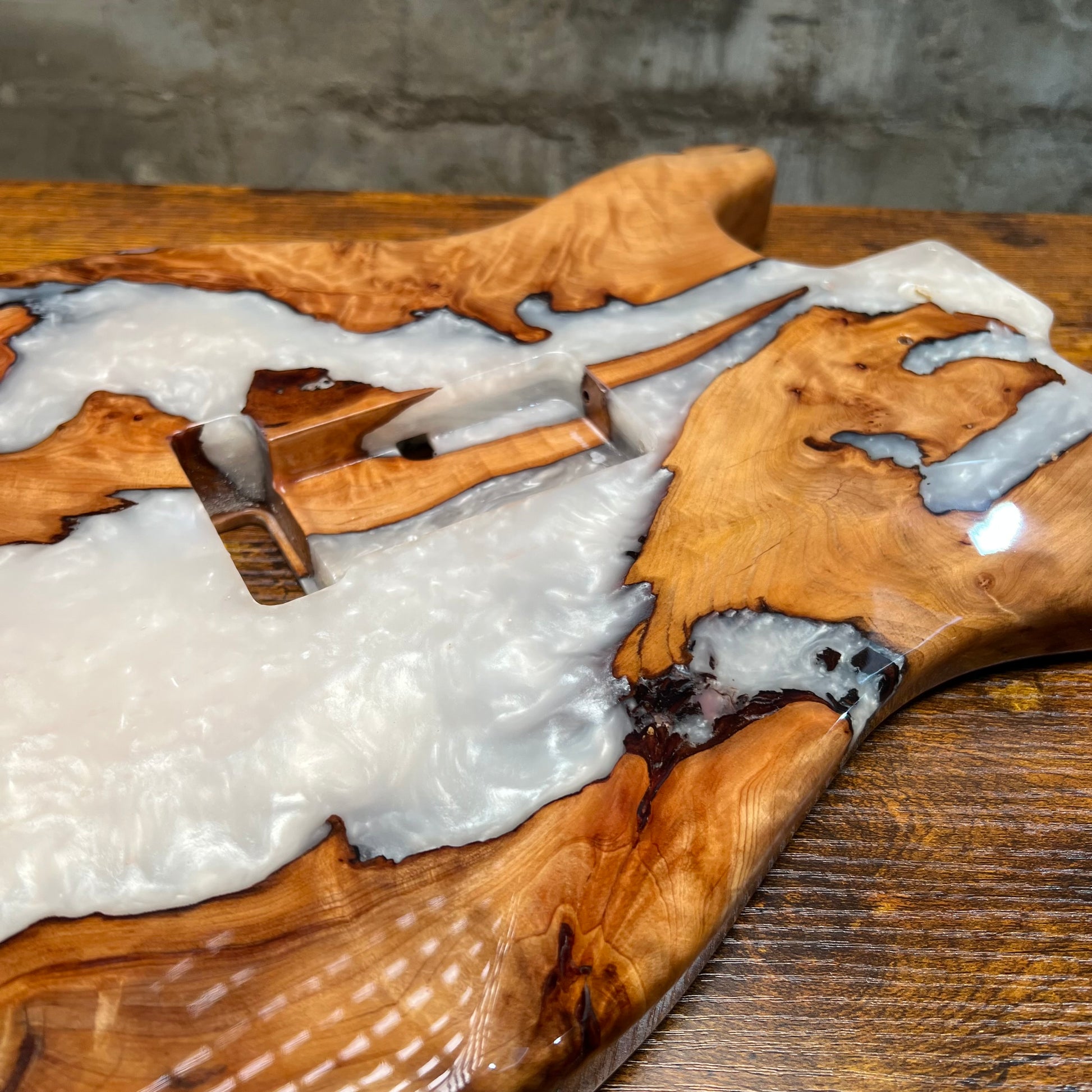 Custom HSH guitar body featuring a white resin pour burl top with a mahogany back and a high-gloss finish for maximum depth and shine.Please note: resin guitar bodies are heavier than standard wood bodies due to the amount of resin used—review the listed weight before purchasing.