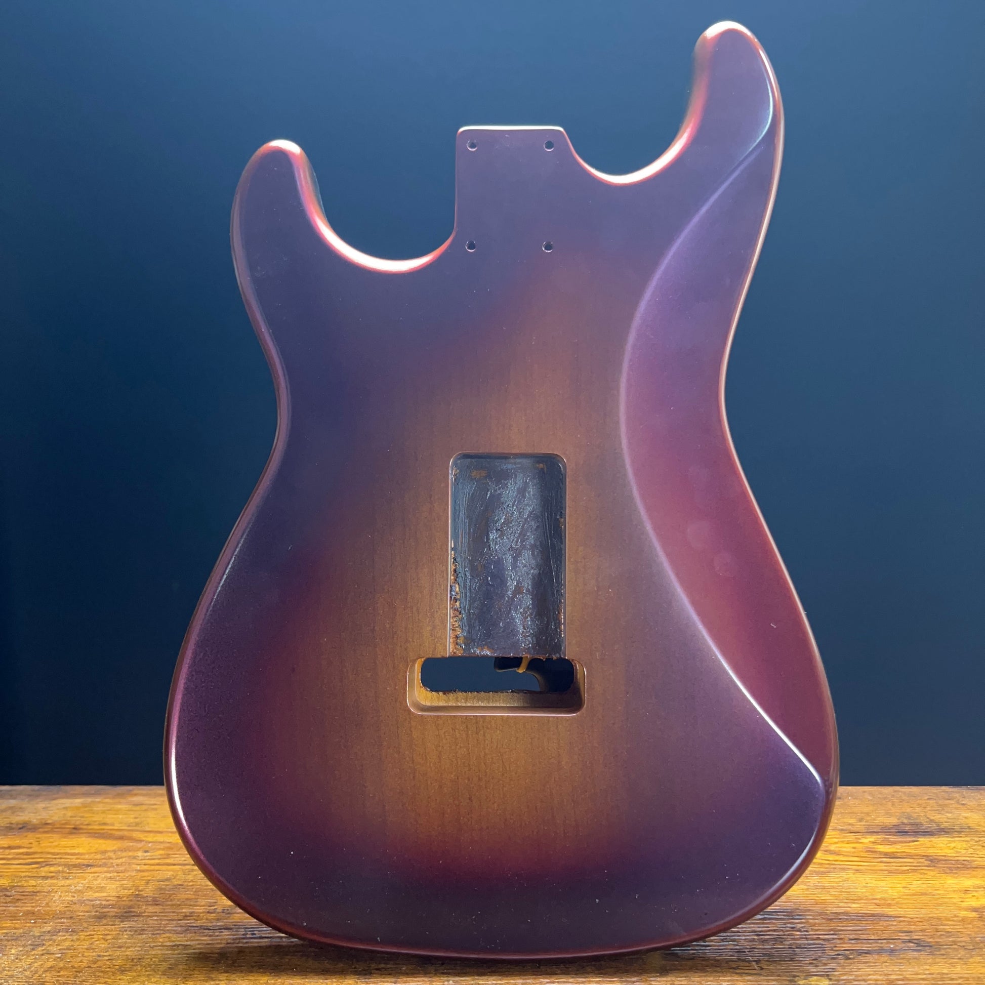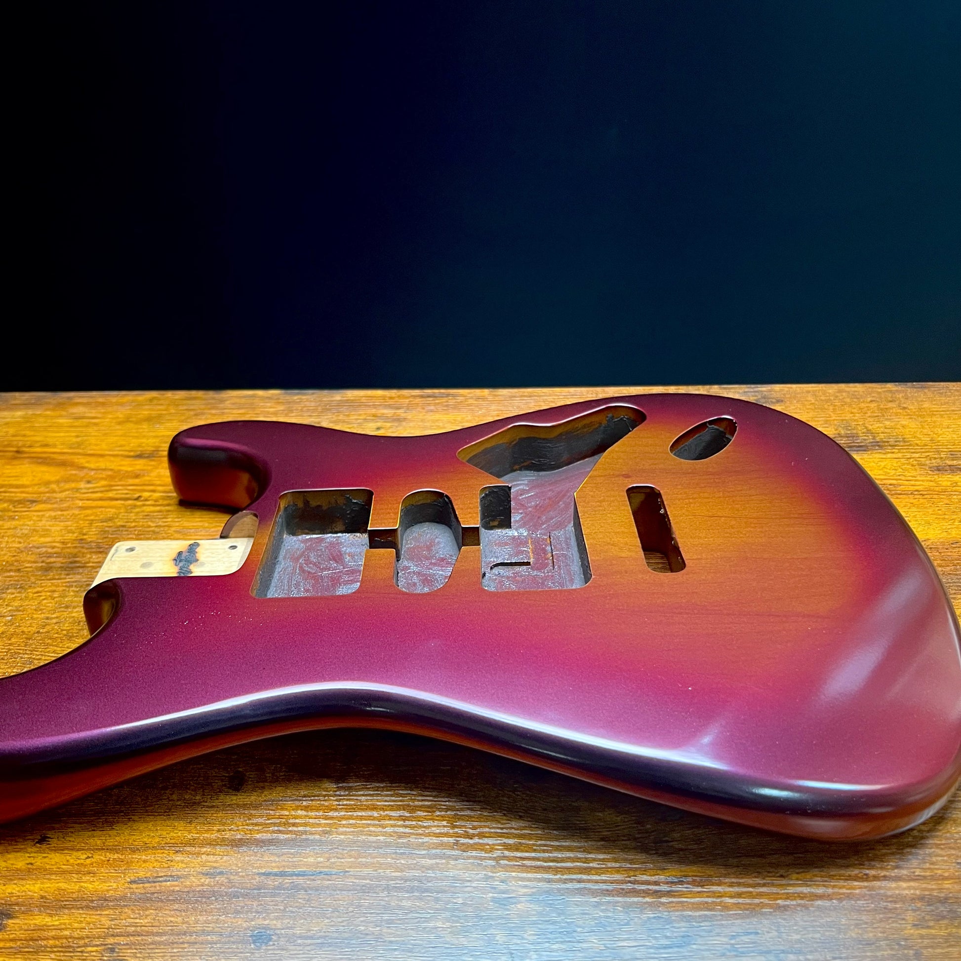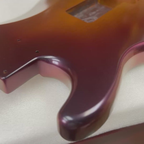This b stock Strat guitar body from Warmtone Custom Guitars features a striking color shift from black to red burst over Brown Please review all photos carefully, as capturing the changing colors in different lightings can be challenging. Keep in mind that there are flaws in the finish, Consider this before making a purchase, as this item is being offered at a discounted price.