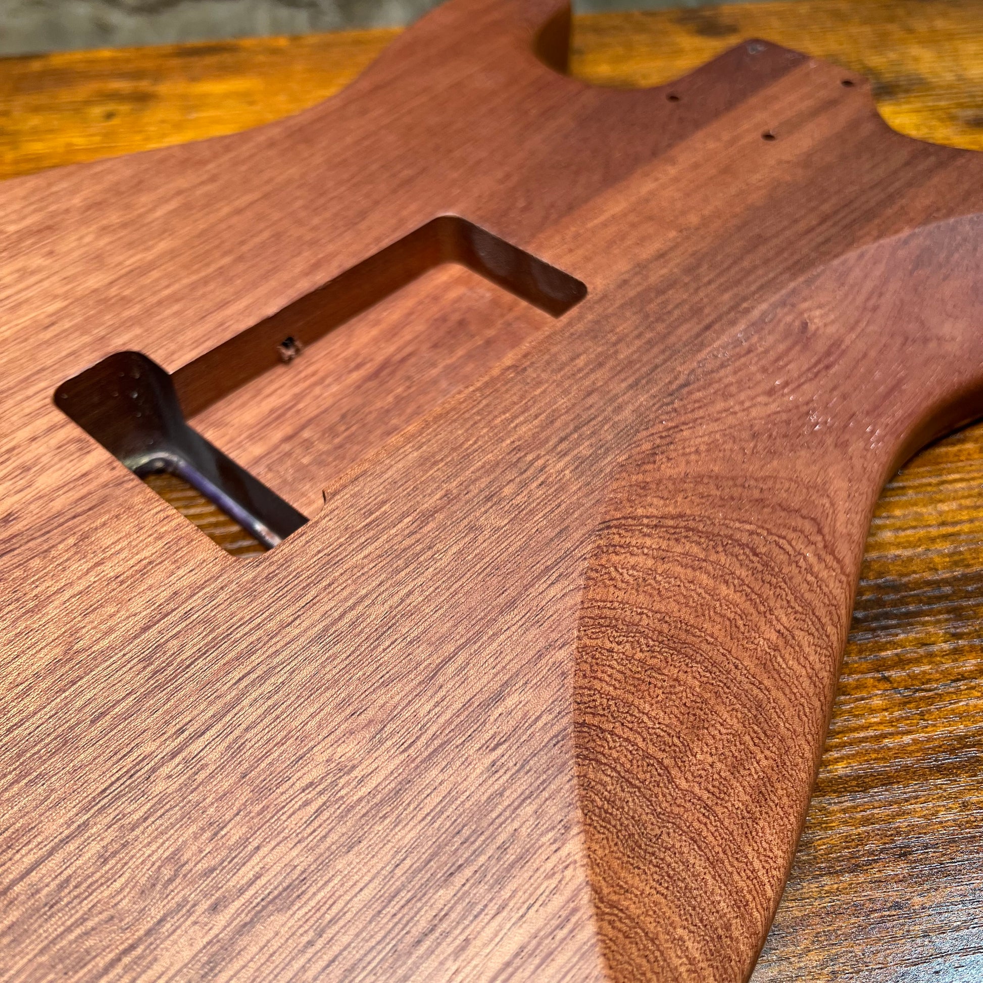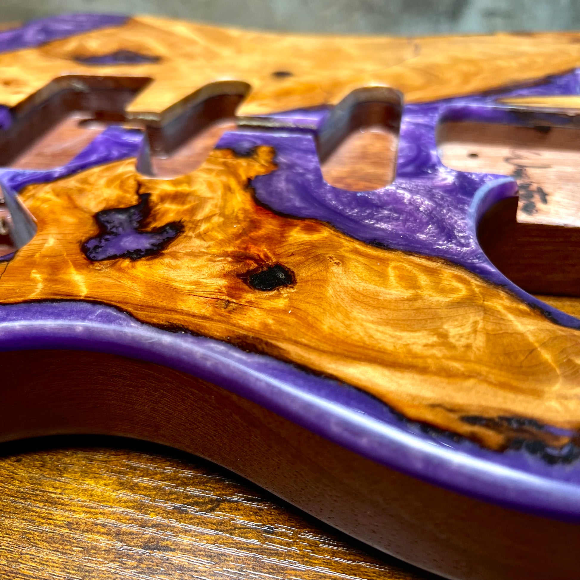 Custom HSS guitar body featuring a resin pour, burl top with a matte mahogany back and a high-gloss finish for maximum depth and shine.
